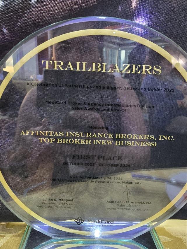Affinitas Insurance Brokers, Inc. was recognized as Top Broker for New Business (First Place) for the period October 2023 to October 2024 during the MediCard “Trailblazers” Sales Awards and Kick-Off, held at the MediCard Philippines headquarters, AIA Tower, Paseo de Roxas, Makati City.